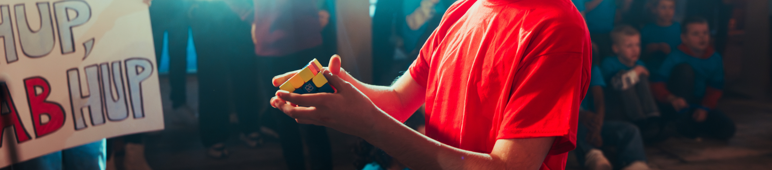 Een leerling moet de kubus zo snel mogelijk oplossen terwijl hij/zij touwtje springt. (Zo’n groot touw, dat door de rest van de klas wordt bediend.)